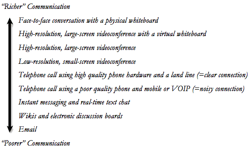 First, there are practical considerations. The various modes of communication – email, telephone, face-to-face conversation – can be placed on a "richness" scale, which looks something like this: