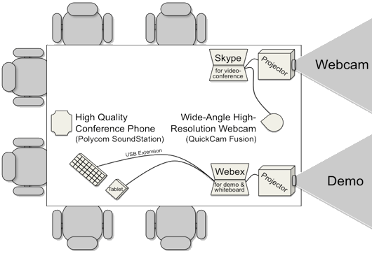 Finally, for the key Scrum Meetings – Sprint Planning, Product Backlog Grooming, Sprint Review, and Sprint Retrospective – it's helpful to have simultaneous videoconferencing and whiteboarding capability. The following diagram shows a conference room with an ad-hoc setup for doing this, with two projectors side-by-side (one projector displaying the Skype video feed from the other location, and the second projector displaying the shared desktop or virtual whiteboard), plus a high-quality conference phone on a land-line.